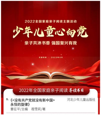第27个“世界读书日”来临之际,石家庄市作家协会组织创作的红色革命英烈故事系列丛书《闪耀的红星》中的《〈没有共产党就没有新中国〉——永恒的旋律》入选了中国儿童中心主办的第二届“童阅中国”原创好童书年度入围100种和全国妇联主办的“少年儿童心向党——亲子共沐书香 强国复兴有我”全国家庭亲子阅读主题活动导读书目。