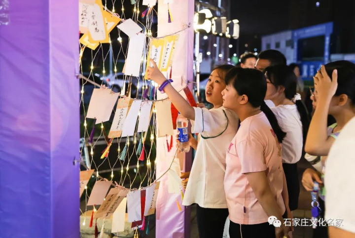 “巧对诗词”环节将活动推向高潮,观众纷纷站在挂满七夕诗词的卡片墙前,与主持人对答诗词的下半句,现场气氛温馨而热烈。另外,现场还设有汉服体验区,小朋友们排队化古妆、穿汉服。
