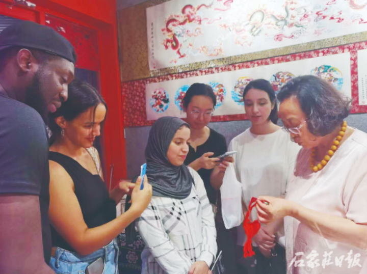 留学生到周淑英民间文艺家工作室参观。