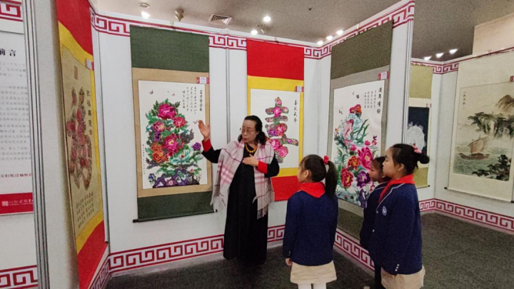 展览上,周淑英给孩子们讲解了“龙马精神”“喜从天降”等剪纸作品的创作过程,介绍每一幅剪纸的美好寓意,声情并茂地讲授蔚县剪纸、染色技法,给孩子们带来了一堂生动有趣的剪纸课。