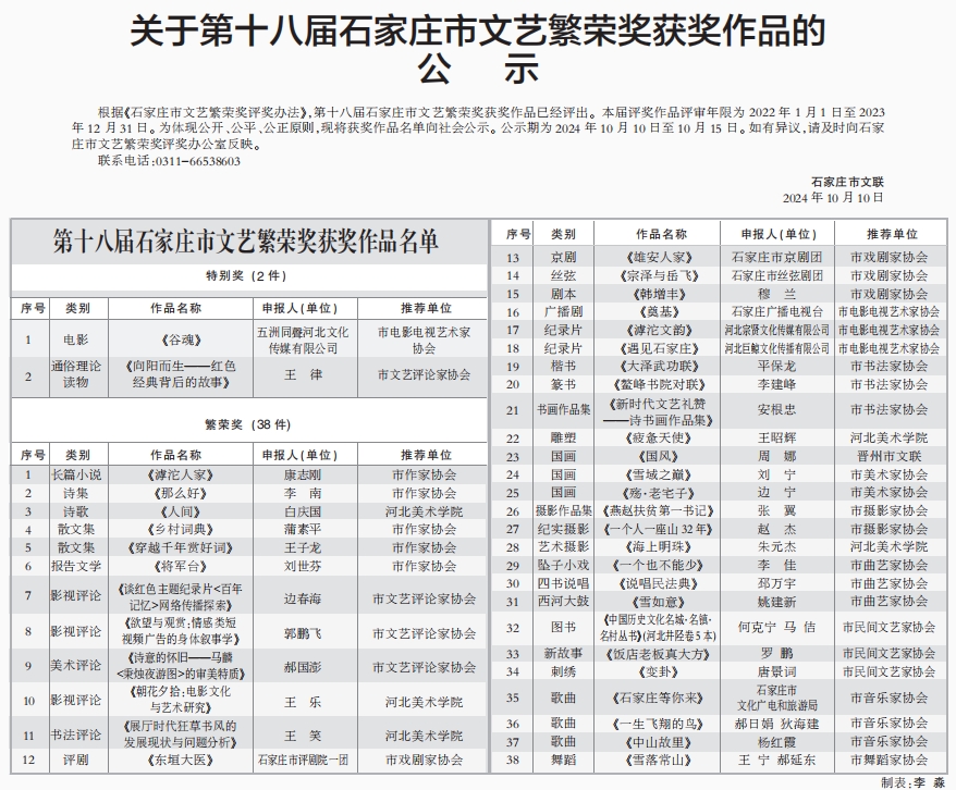 根据《石家庄市文艺繁荣奖评奖办法》,第十八届石家庄市文艺繁荣奖获奖作品已经评出。本届评奖作品评审年限为2022年1月1日至2023年12月31日。为体现公开、公平、公正原则,现将获奖作品名单向社会公示。公示期为2024年10月10日至10月15日。如有异议,请及时向石家庄市文艺繁荣奖评奖办公室反映。