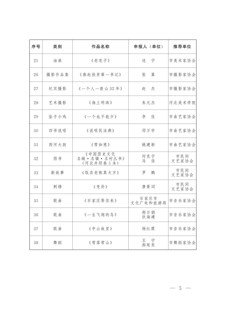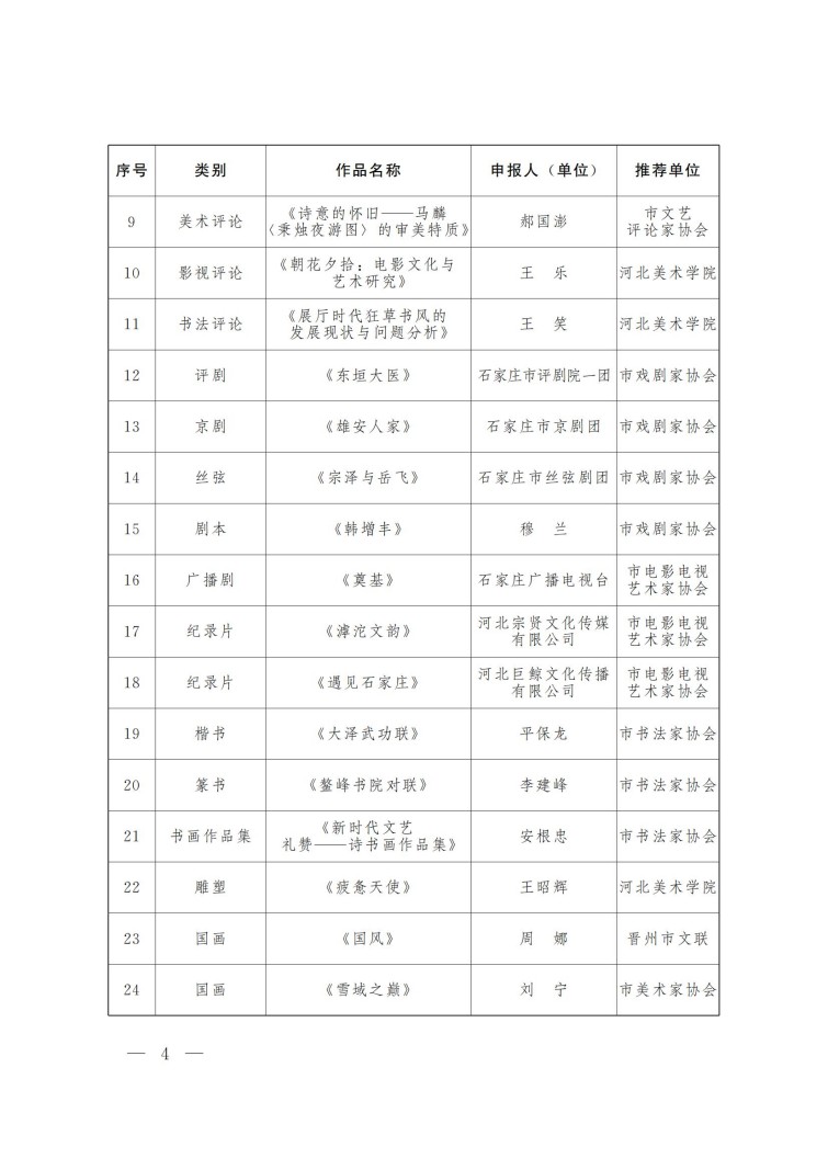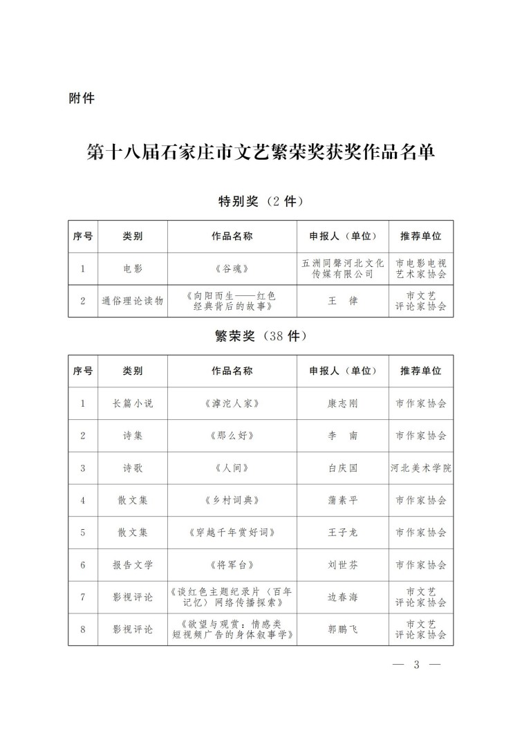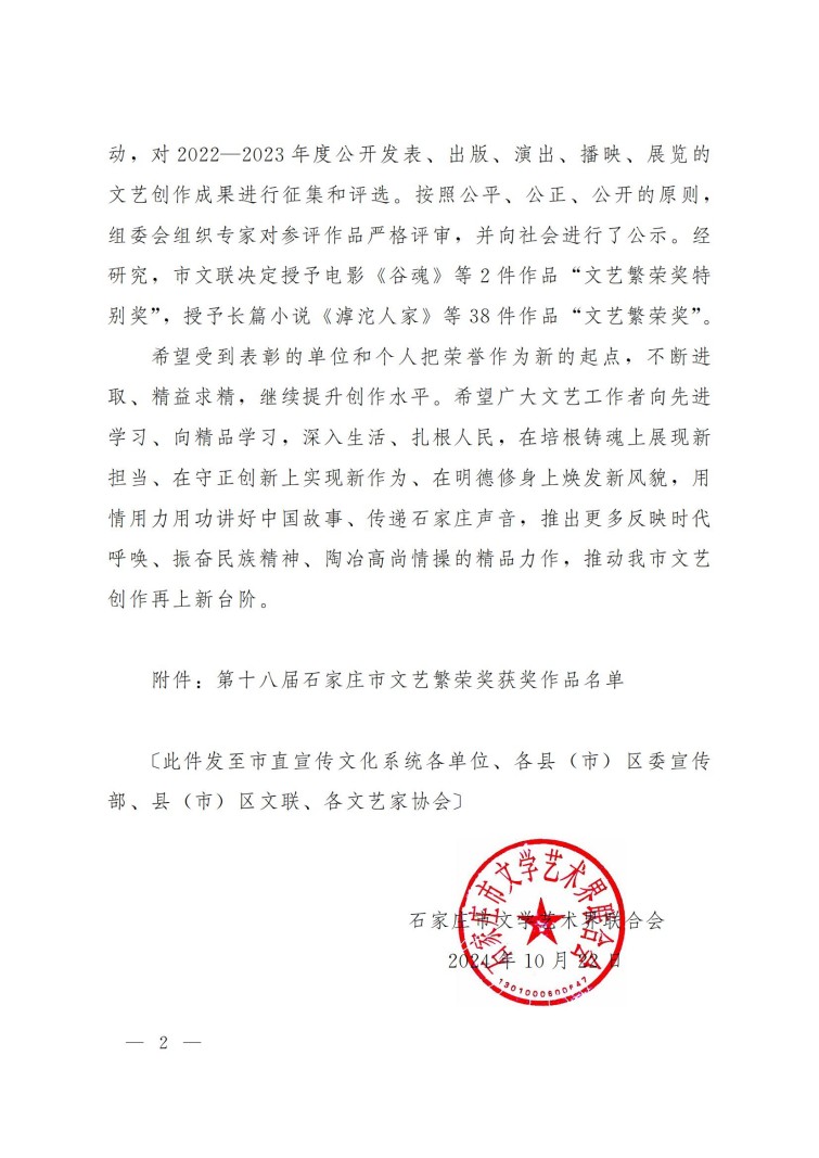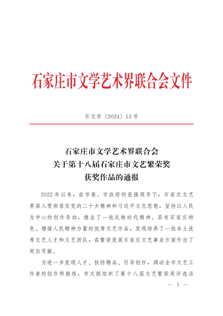 石家庄市文学艺术界联合会关于第十八届石家庄市文艺繁荣奖获奖作品的通报