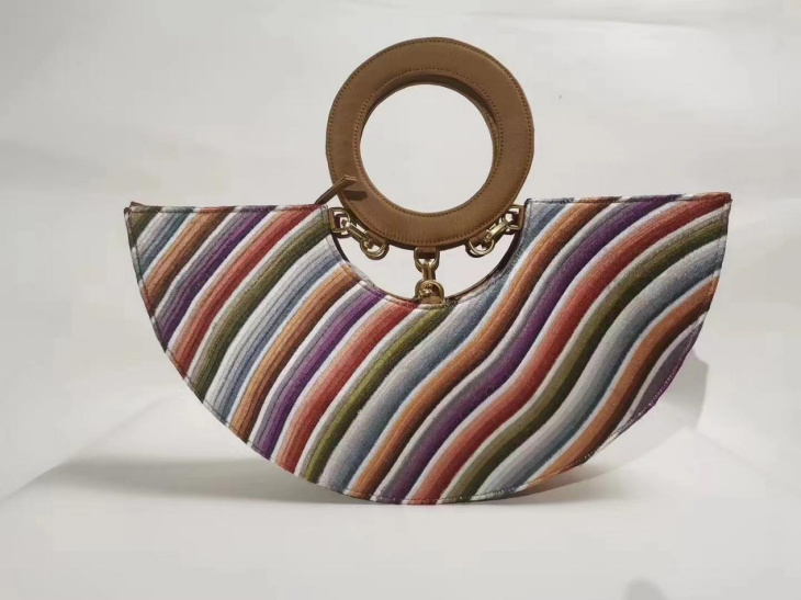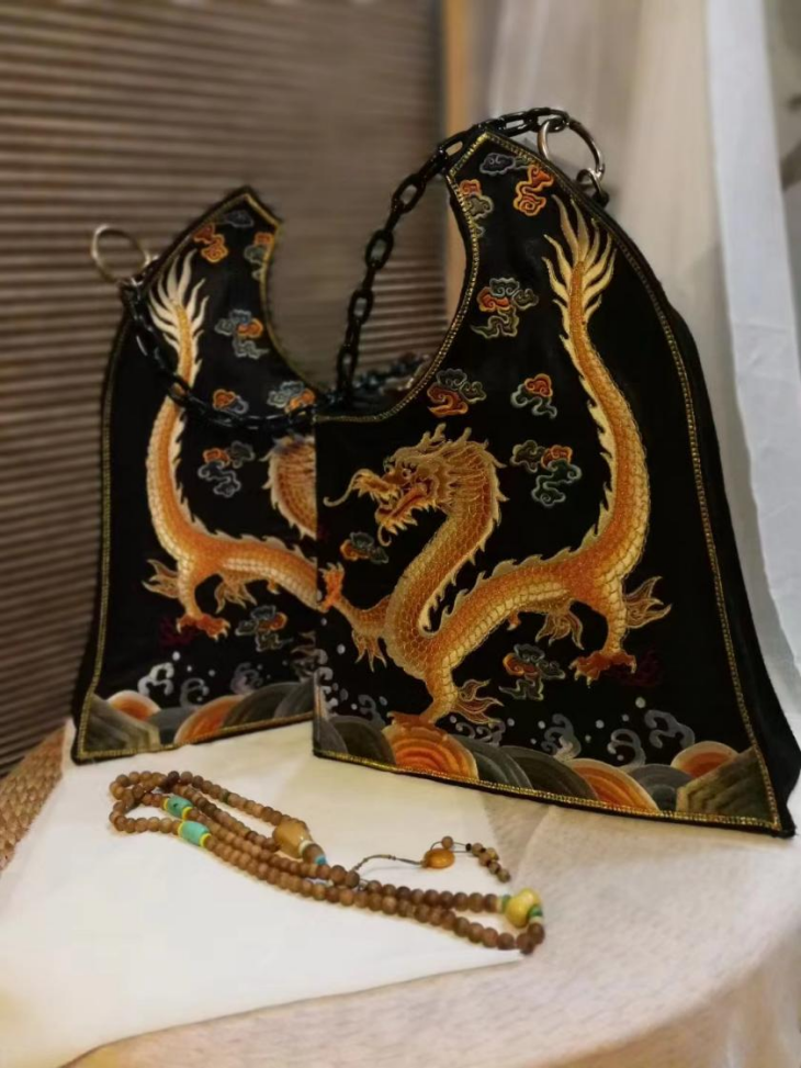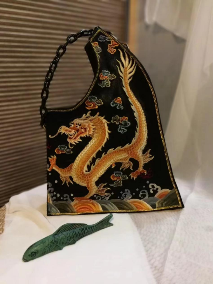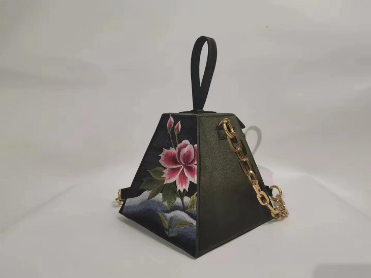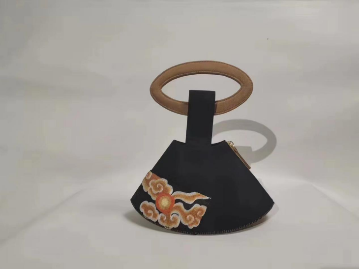 作品简介:《变卦》是布艺与刺绣相结合的女士手拎包系列作品。作品刺绣材料取材于某剧装厂戏装残片,作者在一次考察中,发现这些有瑕疵的绣片被当做废料或刺绣工人直接当坐垫使用,觉得很可惜,以低廉的价格购买了一些回来做研发。基于“用”字方针,将残次部分舍去,剩余部分和女性日用的箱包结合,让残次的工艺品通过修正走进生活,焕发第二次生命。