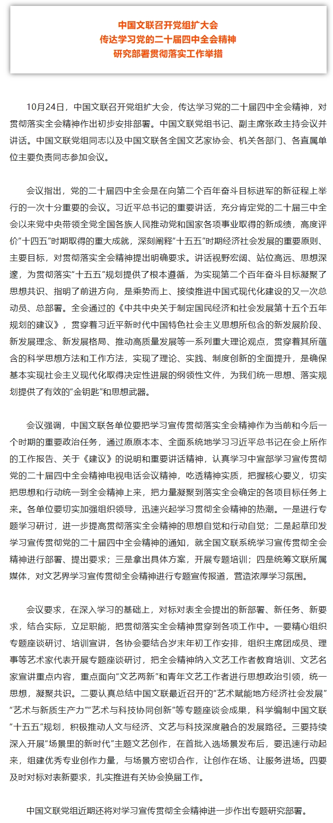 中国文联召开党组扩大会 传达学习党的二十届四中全会精神 研究部署贯彻落实工作举措