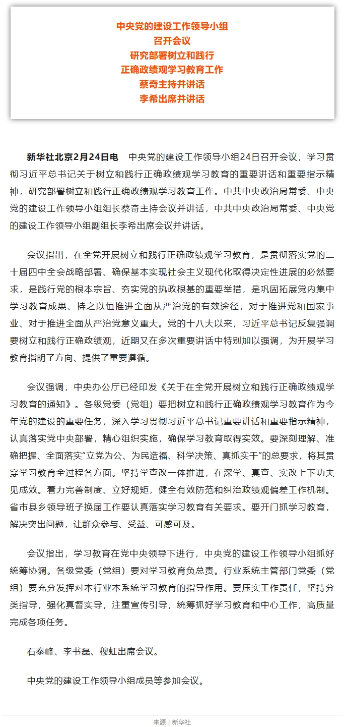 中央党的建设工作领导小组召开会议 研究部署树立和践行正确政绩观学习教育工作