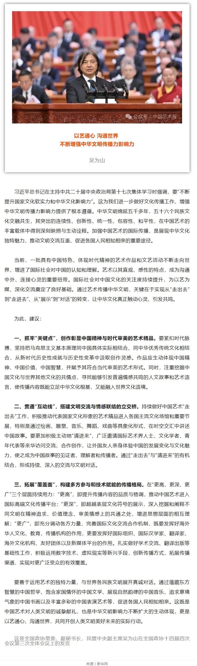 吴为山:以艺通心 沟通世界 不断增强中华文明传播力影响力