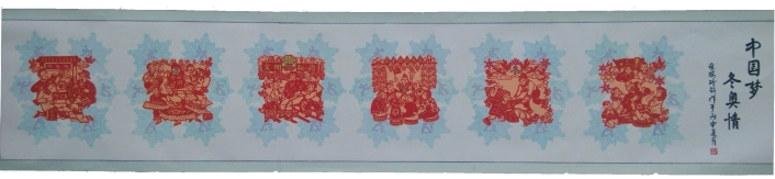 “中国梦▪冬奥情”剪纸用六副剪纸画面表现主题;六副剪纸的花边背景均为淡蓝色,在背景花边里又刻画了几项冬奥运动会项目,另冬奥会的竞技体育精神鲜活体现于剪纸上。