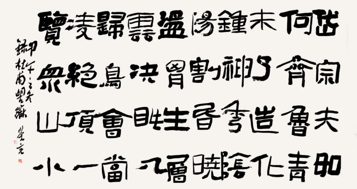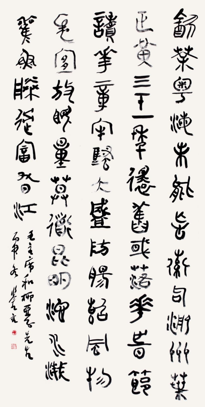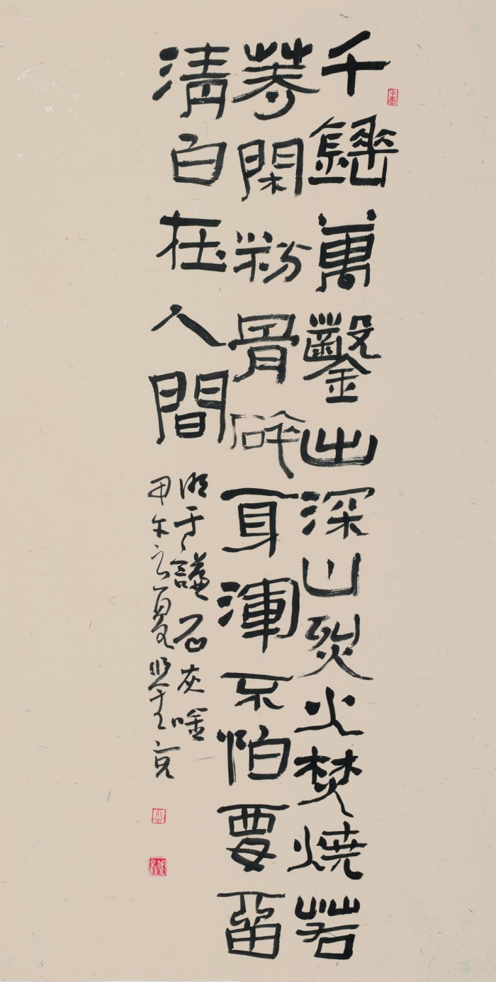 全面考察肖建科多年来在书坛上的表现,最能体现其审美追求,代表其创作水准的,是其具有浓厚金石气息的行书。自从清代中后期金石复兴以来,“金石气”作为一种新兴的审美类型,在书法界被广泛接受和持续传承,从何绍基、赵之谦、翁同龢、吴昌硕直到近代的于右任、沙孟海,众多杰出书家在这方面取得了令人赞叹的成就。肖建科也选择了这条道路,他并没有固守某一家风格,继续重复前人面目,而是充分利用和发挥自己对书法的理解,从一开始就展现出对运笔、用墨的敏锐能力,提炼和巩固着属于自己的面目样式。在他的作品中,可以感受到碑派书风特有的雄浑坚实的点画、奇崛错落的字形以及凝重苍茫的墨色变化,显示着作者对前人的吸收承接,但又无法具体对应到某一书家,由此正体现出肖建科在艺术上坚持自我,善于思考领悟的优秀素质。