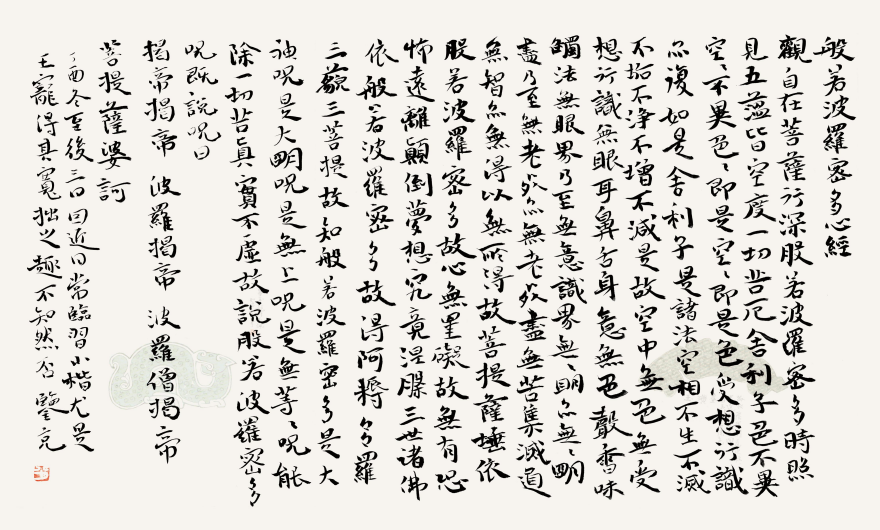 观自在菩萨,行深般若波罗蜜多时,照见五蕴皆空,度一切苦厄。舍利子,色不异空,空不异色,色即是空,空即是色,受想行识,亦复如是。舍利子,是诸法空相,不生不灭,不垢不净,不增不减。是故空中无色,无受想行识,无眼耳鼻舌身意,无色声香味触法,无眼界,乃至无意识界,无无明,亦无无明尽,乃至无老死,亦无老死尽。无苦集灭道,无智亦无得。以无所得故。菩提萨埵,依般若波罗蜜多故,心无挂碍。无挂碍故,无有恐怖,远离颠倒梦想,究竟涅盘。三世诸佛,依般若波罗蜜多故,得阿耨多罗三藐三菩提。故知般若波罗蜜多,是大神咒,是大明咒,是无上咒,是无等等咒,能除一切苦,真实不虚。故说般若波罗蜜多咒,既说咒曰:揭谛揭谛,波罗揭谛,波罗僧揭谛,菩提萨婆诃。